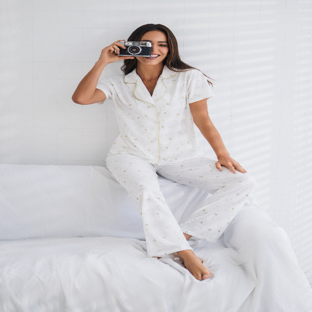 Pijama para mujer en algodón, compuesta por una camisa manga corta con botones y pantalón de cintura elástica para un ajuste perfecto.